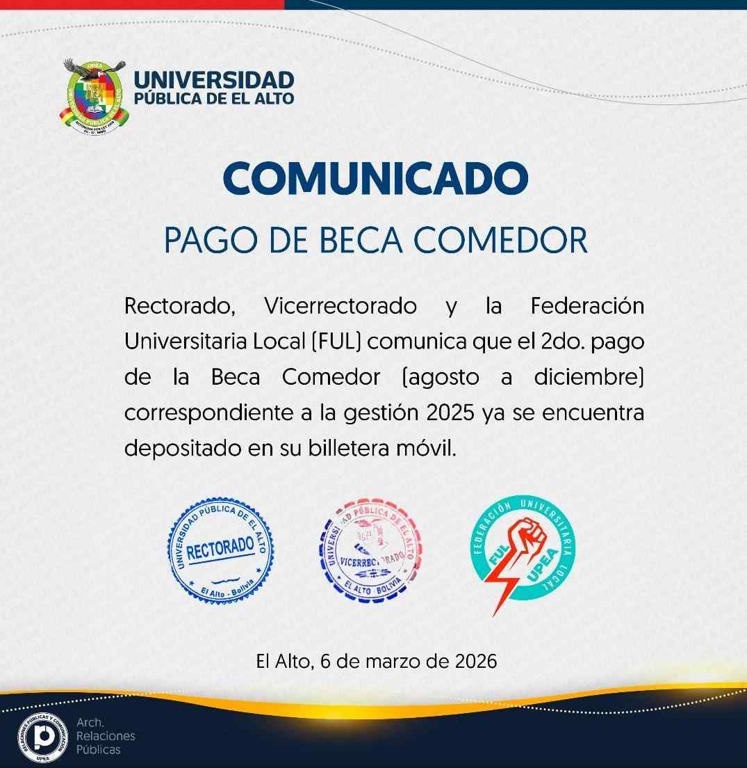 Autoridades del Rectorado, Vicerrectorado y la Federación Universitaria Local de la Universidad Pública de El Alto informaron que el segundo desembolso de la Beca Comedor correspondiente al periodo agosto–diciembre de la gestión 2025 ya fue depositado en las billeteras móviles Yasta de los estudiantes beneficiarios.