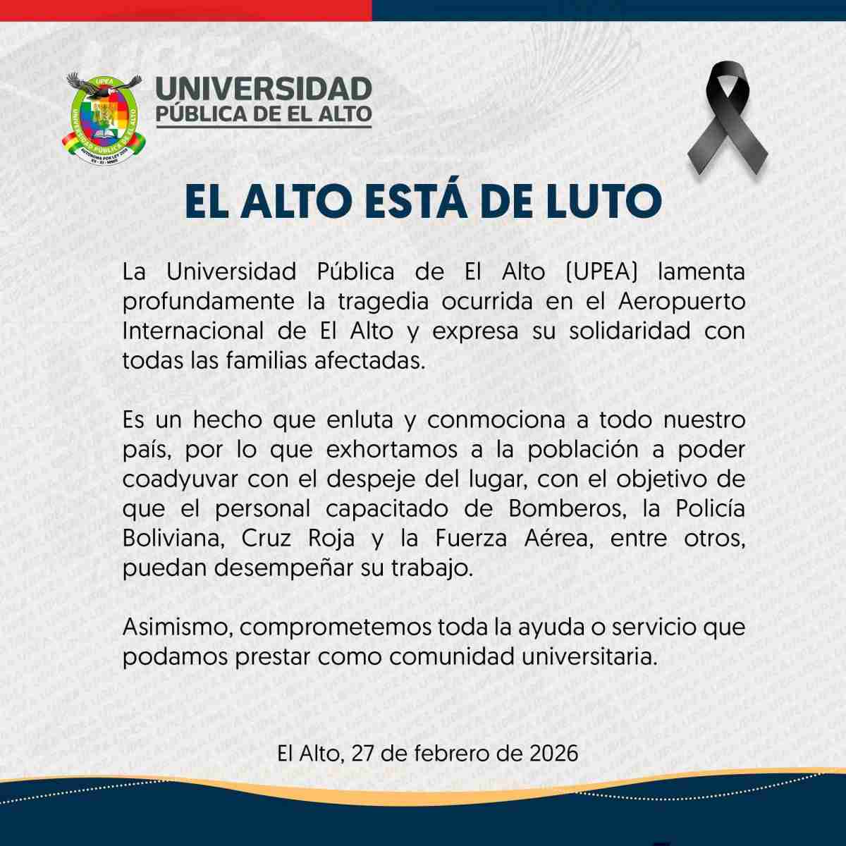 28 de febrero del 2026 DISBEDC-Informa La UPEA expresa profundo pesar por la tragedia en el Aeropuerto Internacional de El Alto Ver publicación